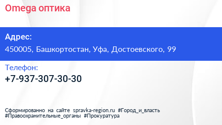 Omega оптика по адресу 450005, Башкортостан, Уфа, Достоевского, 99 в дальнейшем Организация, размещена в следующих категориях: