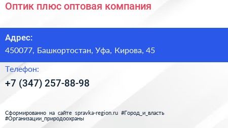 Оптик плюс, оптовая компания по адресу 450077, Башкортостан, Уфа, Кирова, 45 в дальнейшем Организация, размещена в следующих категориях: