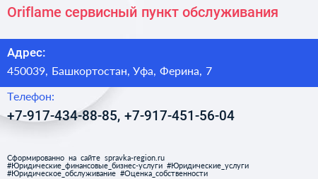 Oriflame, сервисный пункт обслуживания по адресу 450039, Башкортостан, Уфа, Ферина, 7 в дальнейшем Организация, размещена в следующих категориях: