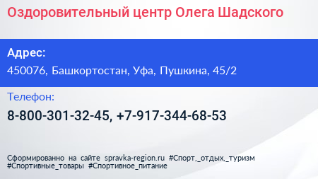 Оздоровительный центр Олега Шадского по адресу 450076, Башкортостан, Уфа, Пушкина, 45/2 в дальнейшем Организация, размещена в следующих категориях: