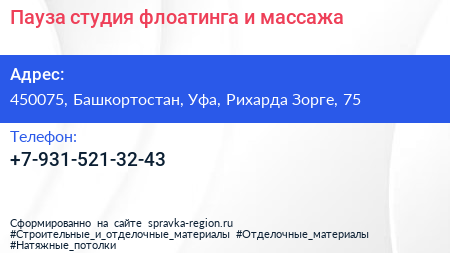 Пауза, студия флоатинга и массажа по адресу 450075, Башкортостан, Уфа, Рихарда Зорге, 75 в дальнейшем Организация, размещена в следующих категориях: