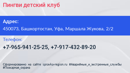Пингви, детский клуб по адресу 450073, Башкортостан, Уфа, Маршала Жукова, 2/2 в дальнейшем Организация, размещена в следующих категориях: