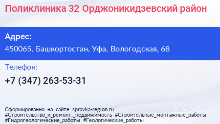 Поликлиника №32, Орджоникидзевский район по адресу 450065, Башкортостан, Уфа, Вологодская, 68 в дальнейшем Организация, размещена в следующих категориях: