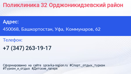 Поликлиника №32, Орджоникидзевский район по адресу 450068, Башкортостан, Уфа, Коммунаров, 62 в дальнейшем Организация, размещена в следующих категориях: