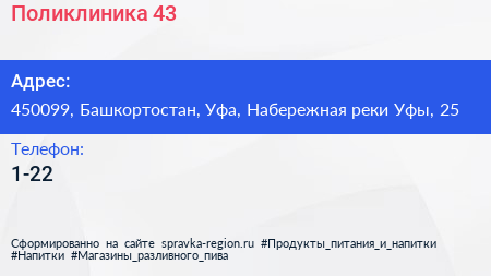 Поликлиника №43 по адресу 450099, Башкортостан, Уфа, Набережная реки Уфы, 25 в дальнейшем Организация, размещена в следующих категориях: