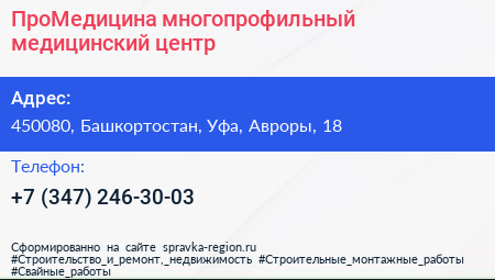 ПроМедицина, многопрофильный медицинский центр по адресу 450080, Башкортостан, Уфа, Авроры, 18 в дальнейшем Организация, размещена в следующих категориях:
