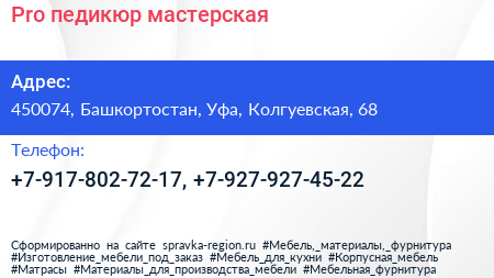 Pro.педикюр, мастерская по адресу 450074, Башкортостан, Уфа, Колгуевская, 68 в дальнейшем Организация, размещена в следующих категориях: