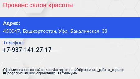 Прованс, салон красоты по адресу 450047, Башкортостан, Уфа, Бакалинская, 33 в дальнейшем Организация, размещена в следующих категориях: