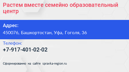 Растем вместе, семейно-образовательный центр по адресу 450076, Башкортостан, Уфа, Гоголя, 36 в дальнейшем Организация, размещена в следующих категориях: