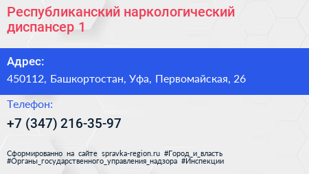 Республиканский наркологический диспансер №1 по адресу 450112, Башкортостан, Уфа, Первомайская, 26 в дальнейшем Организация, размещена в следующих категориях: