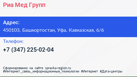 Риа Мед Групп по адресу 450103, Башкортостан, Уфа, Кавказская, 6/6 в дальнейшем Организация, размещена в следующих категориях: