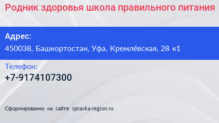 Родник здоровья, школа правильного питания по адресу 450038, Башкортостан, Уфа, Кремлёвская, 28 к1 в дальнейшем Организация, размещена в следующих категориях: