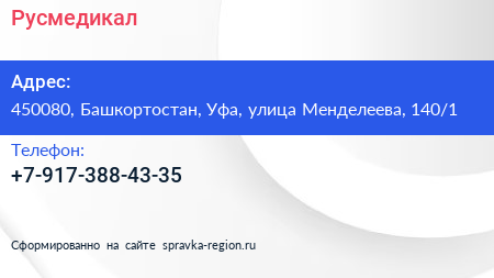 Русмедикал по адресу 450080, Башкортостан, Уфа, улица Менделеева, 140/1 в дальнейшем Организация, размещена в следующих категориях: