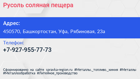 Русоль, соляная пещера по адресу 450570, Башкортостан, Уфа, Рябиновая, 23а в дальнейшем Организация, размещена в следующих категориях: