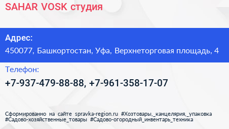SAHAR & VOSK, студия по адресу 450077, Башкортостан, Уфа, Верхнеторговая площадь, 4 в дальнейшем Организация, размещена в следующих категориях: