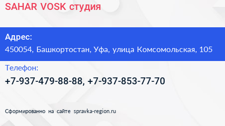 SAHAR & VOSK, студия по адресу 450054, Башкортостан, Уфа, улица Комсомольская, 105 в дальнейшем Организация, размещена в следующих категориях: