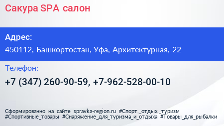 Сакура, SPA-салон по адресу 450112, Башкортостан, Уфа, Архитектурная, 22 в дальнейшем Организация, размещена в следующих категориях: