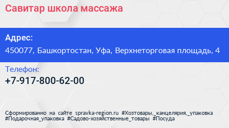 Савитар, школа массажа по адресу 450077, Башкортостан, Уфа, Верхнеторговая площадь, 4 в дальнейшем Организация, размещена в следующих категориях: