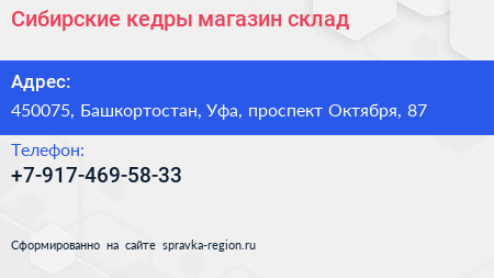 Сибирские кедры, магазин-склад по адресу 450075, Башкортостан, Уфа, проспект Октября, 87 в дальнейшем Организация, размещена в следующих категориях: