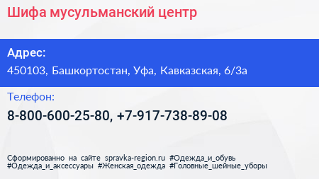 Шифа, мусульманский центр по адресу 450103, Башкортостан, Уфа, Кавказская, 6/3а в дальнейшем Организация, размещена в следующих категориях: