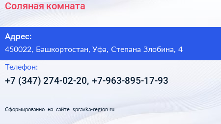 Соляная комната по адресу 450022, Башкортостан, Уфа, Степана Злобина, 4 в дальнейшем Организация, размещена в следующих категориях: