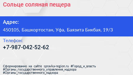Сольце, соляная пещера по адресу 450105, Башкортостан, Уфа, Баязита Бикбая, 19/3 в дальнейшем Организация, размещена в следующих категориях: