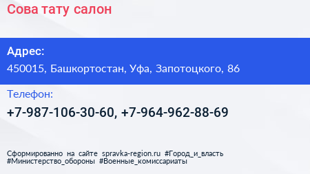 Сова, тату-салон по адресу 450015, Башкортостан, Уфа, Запотоцкого, 86 в дальнейшем Организация, размещена в следующих категориях: