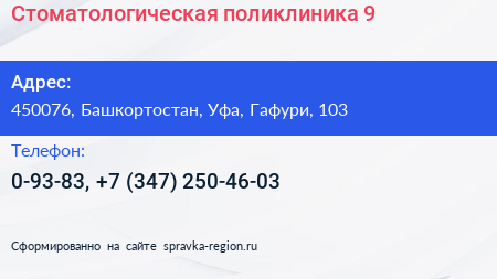 Стоматологическая поликлиника №9 по адресу 450076, Башкортостан, Уфа, Гафури, 103 в дальнейшем Организация, размещена в следующих категориях: