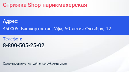 Стрижка Shop, парикмахерская по адресу 450005, Башкортостан, Уфа, 50-летия Октября, 12 в дальнейшем Организация, размещена в следующих категориях: