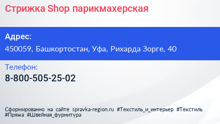 Стрижка Shop, парикмахерская по адресу 450059, Башкортостан, Уфа, Рихарда Зорге, 40 в дальнейшем Организация, размещена в следующих категориях: