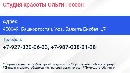 Студия красоты Ольги Гессон по адресу 450049, Башкортостан, Уфа, Баязита Бикбая, 17 в дальнейшем Организация, размещена в следующих категориях: