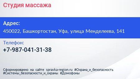 Студия массажа по адресу 450022, Башкортостан, Уфа, улица Менделеева, 141 в дальнейшем Организация, размещена в следующих категориях:
