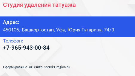 Студия удаления татуажа по адресу 450105, Башкортостан, Уфа, Юрия Гагарина, 74/3 в дальнейшем Организация, размещена в следующих категориях: