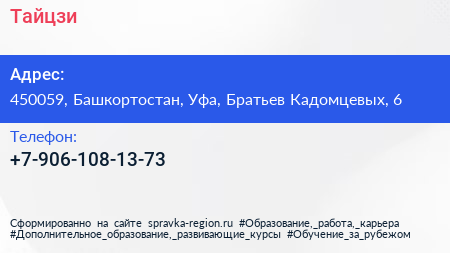 Тайцзи по адресу 450059, Башкортостан, Уфа, Братьев Кадомцевых, 6 в дальнейшем Организация, размещена в следующих категориях: