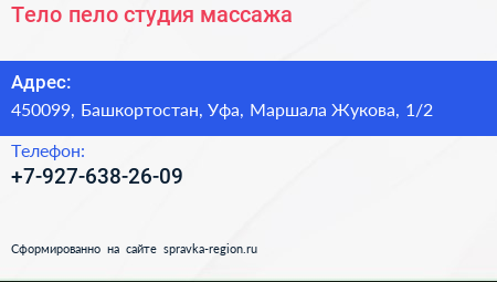 Тело пело, студия массажа по адресу 450099, Башкортостан, Уфа, Маршала Жукова, 1/2 в дальнейшем Организация, размещена в следующих категориях: