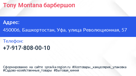 Tony Montana, барбершоп по адресу 450006, Башкортостан, Уфа, улица Революционная, 57 в дальнейшем Организация, размещена в следующих категориях: