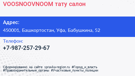 VOOSNOOVNOOM, тату-салон по адресу 450001, Башкортостан, Уфа, Бабушкина, 52 в дальнейшем Организация, размещена в следующих категориях: