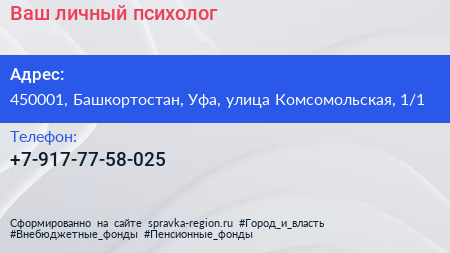 Ваш личный психолог по адресу 450001, Башкортостан, Уфа, улица Комсомольская, 1/1 в дальнейшем Организация, размещена в следующих категориях: