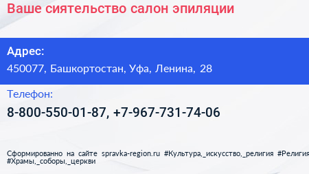 Ваше сиятельство, салон эпиляции по адресу 450077, Башкортостан, Уфа, Ленина, 28 в дальнейшем Организация, размещена в следующих категориях: