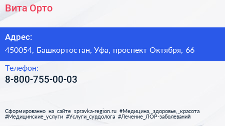 Вита Орто по адресу 450054, Башкортостан, Уфа, проспект Октября, 66 в дальнейшем Организация, размещена в следующих категориях:
