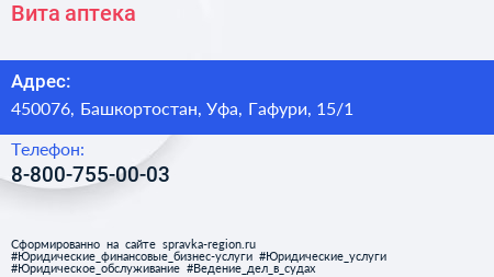 Вита, аптека по адресу 450076, Башкортостан, Уфа, Гафури, 15/1 в дальнейшем Организация, размещена в следующих категориях: