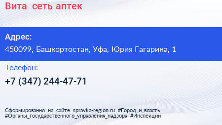Вита+, сеть аптек по адресу 450099, Башкортостан, Уфа, Юрия Гагарина, 1 в дальнейшем Организация, размещена в следующих категориях: