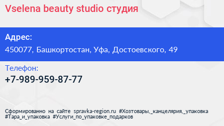 Vselena beauty studio, студия по адресу 450077, Башкортостан, Уфа, Достоевского, 49 в дальнейшем Организация, размещена в следующих категориях: