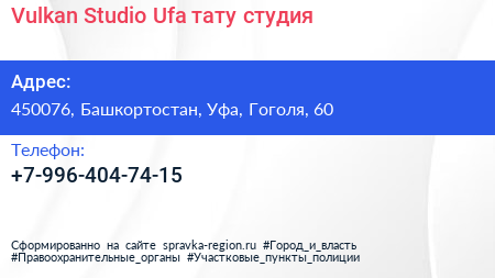 Vulkan Studio Ufa, тату-студия по адресу 450076, Башкортостан, Уфа, Гоголя, 60 в дальнейшем Организация, размещена в следующих категориях: