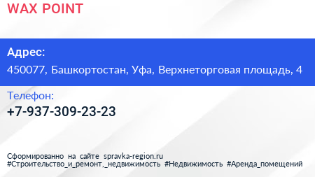 WAX POINT по адресу 450077, Башкортостан, Уфа, Верхнеторговая площадь, 4 в дальнейшем Организация, размещена в следующих категориях: