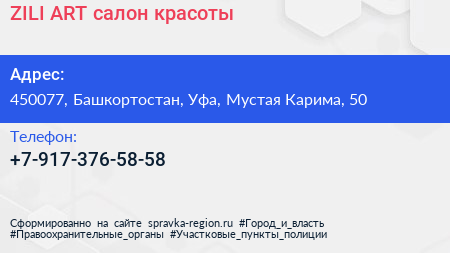 ZILI ART, салон красоты по адресу 450077, Башкортостан, Уфа, Мустая Карима, 50 в дальнейшем Организация, размещена в следующих категориях: