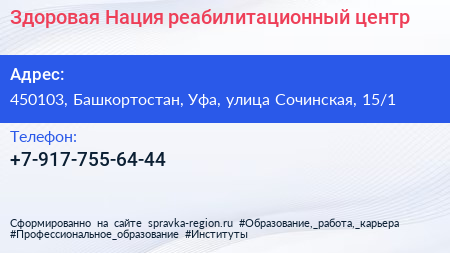 Здоровая Нация, реабилитационный центр по адресу 450103, Башкортостан, Уфа, улица Сочинская, 15/1 в дальнейшем Организация, размещена в следующих категориях: