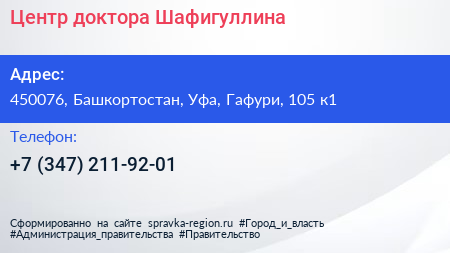 Центр доктора Шафигуллина по адресу 450076, Башкортостан, Уфа, Гафури, 105 к1 в дальнейшем Организация, размещена в следующих категориях: