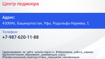 Центр педикюра по адресу 450096, Башкортостан, Уфа, Рудольфа Нуреева, 1 в дальнейшем Организация, размещена в следующих категориях: