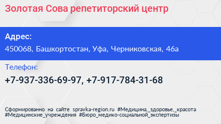 Золотая Сова, репетиторский центр по адресу 450068, Башкортостан, Уфа, Черниковская, 46а в дальнейшем Организация, размещена в следующих категориях: